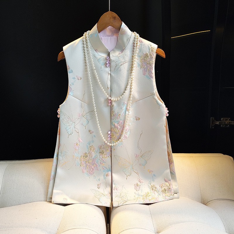 2024 Spring New Chinese Jacquard Stand Collar Bead Buckle Vest New National Style Retro Sleeveless Jacket Women's Horse Clip Top