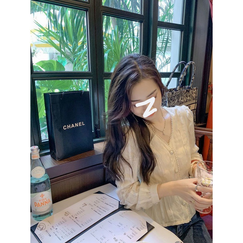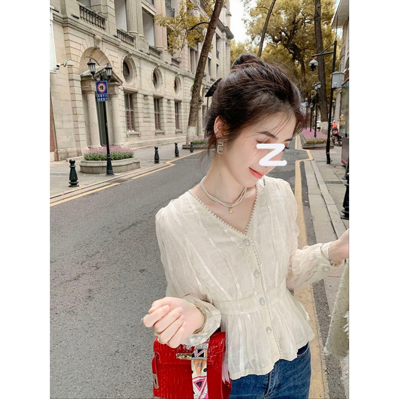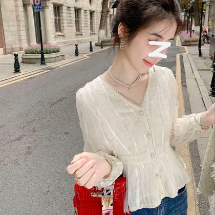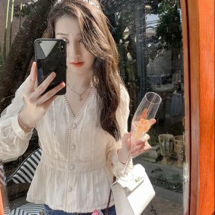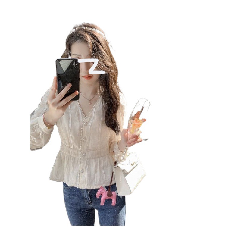 | nameOriginal | 2024 Spring New Niche V-neck Shirt Trendy Western Chiffon Shirt Pearl Tight Waist Slim Inner Top Women |