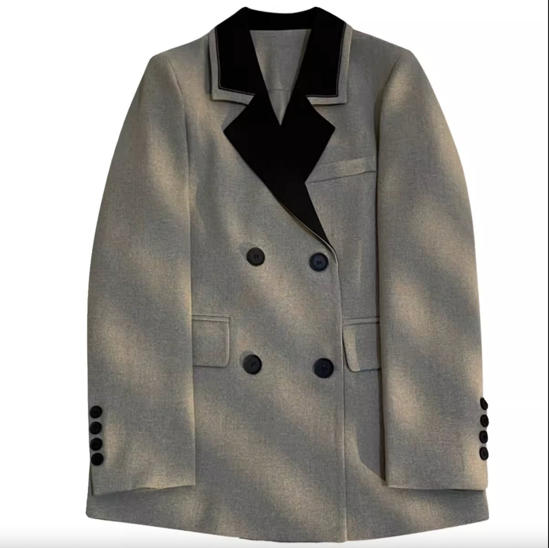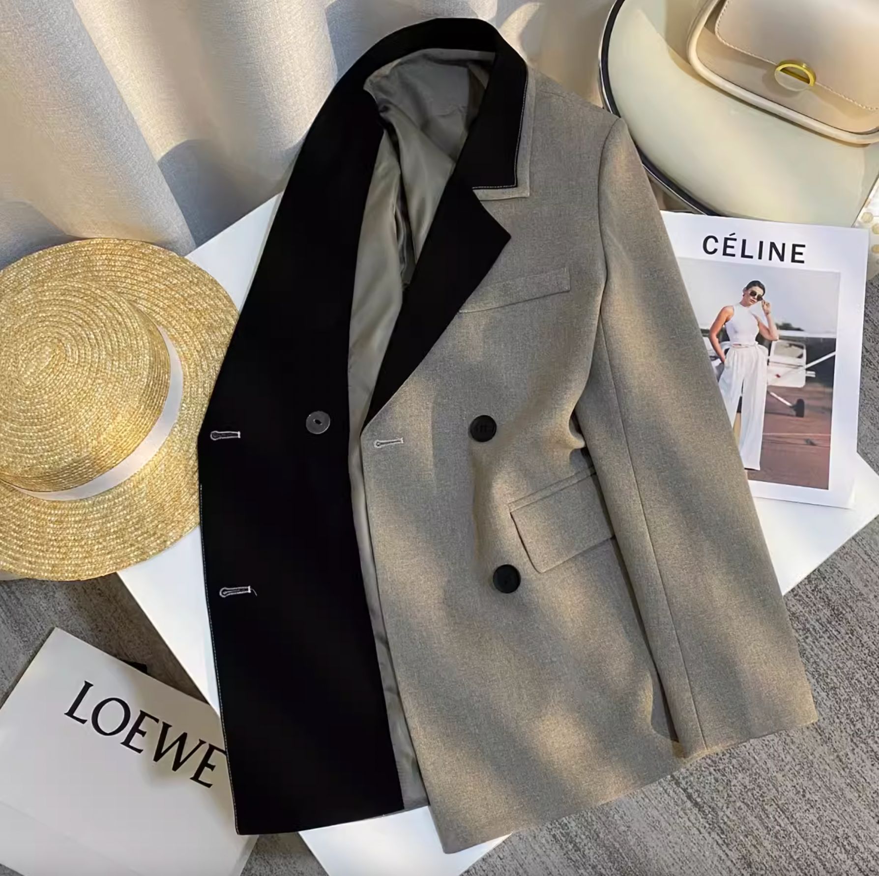 2024 spring new stitching design black Gray contrast color suit jacket women's stitching trendy all-match casual top