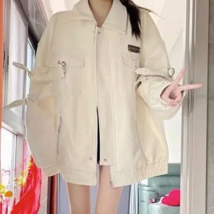 سترة جلدية نسائية ربيعية جديدة بتصميم رائع ورائع موديل 2024 سترة جلدية فضفاضة تناسب جميع الأعمار مستوحاة من Instagram
