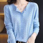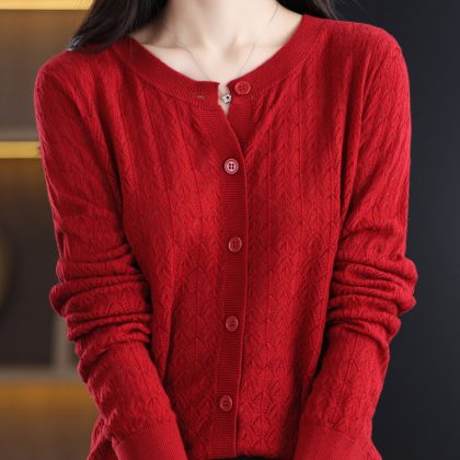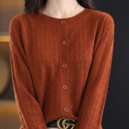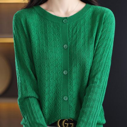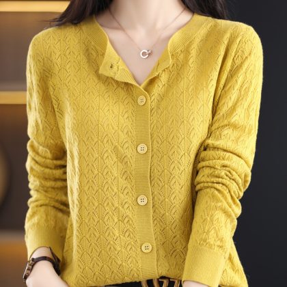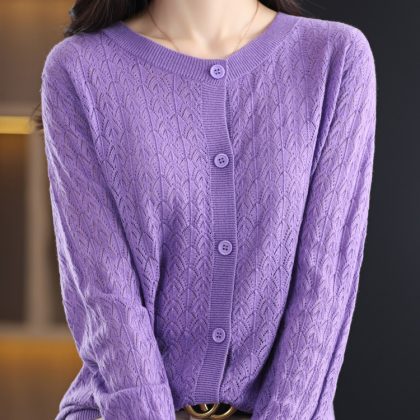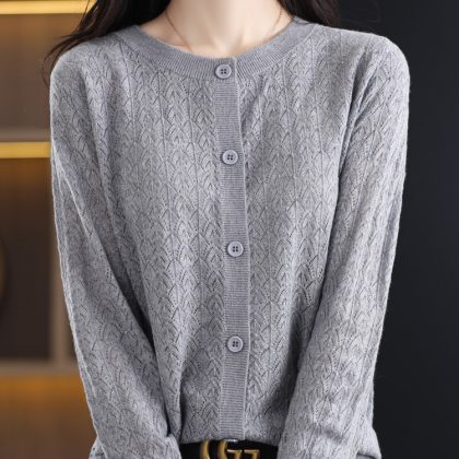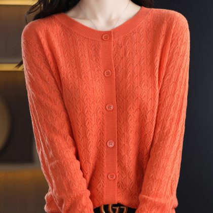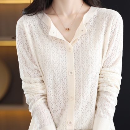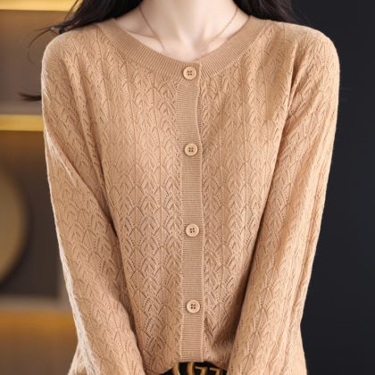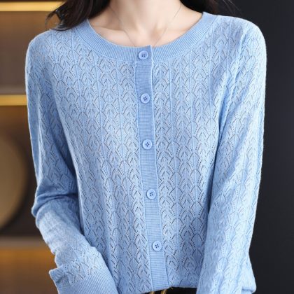 سترة محبوكة مجوفة من الصوف الصوفي للربيع 2024 سترة نسائية معطف برقبة دائرية منخفضة ملابس خارجية قصيرة