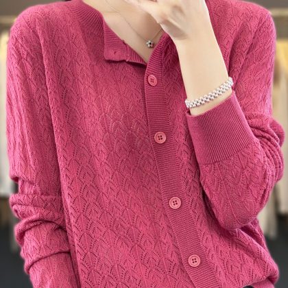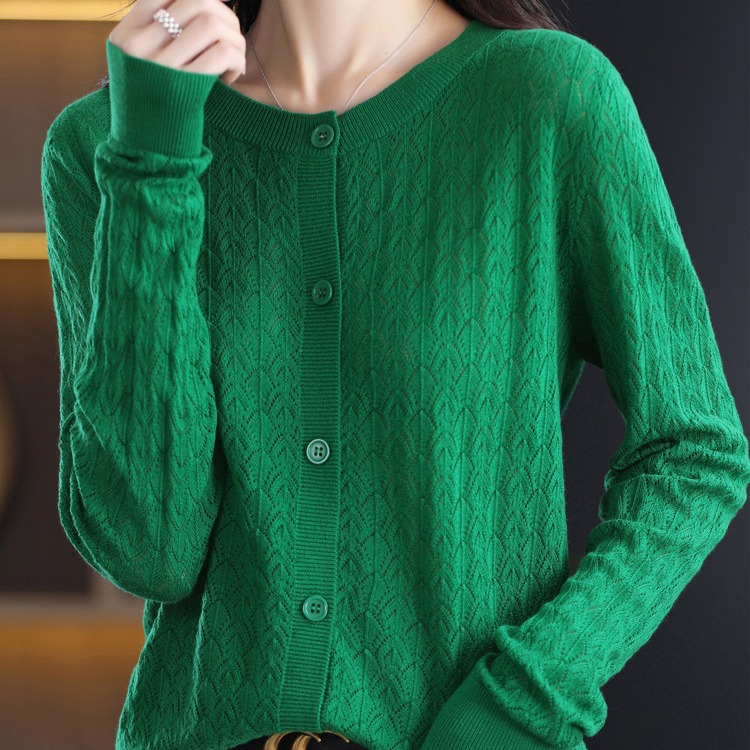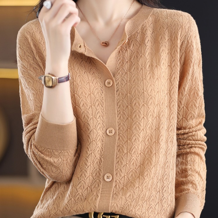 2024 spring worsted wool phoenix tail hollow knitted cardigan women's sweater coat low round neck top short outer wear