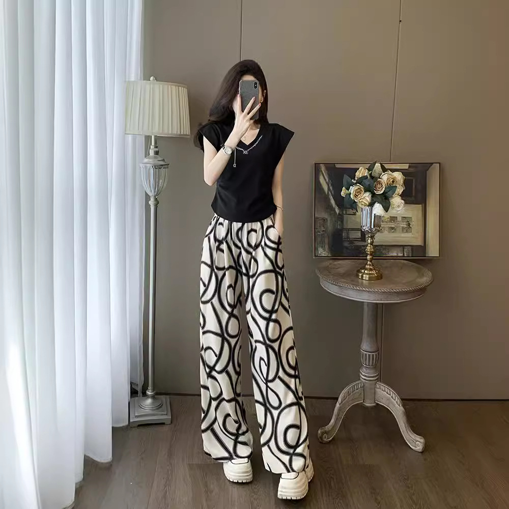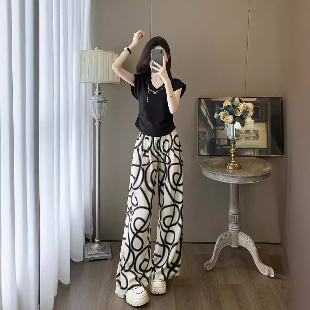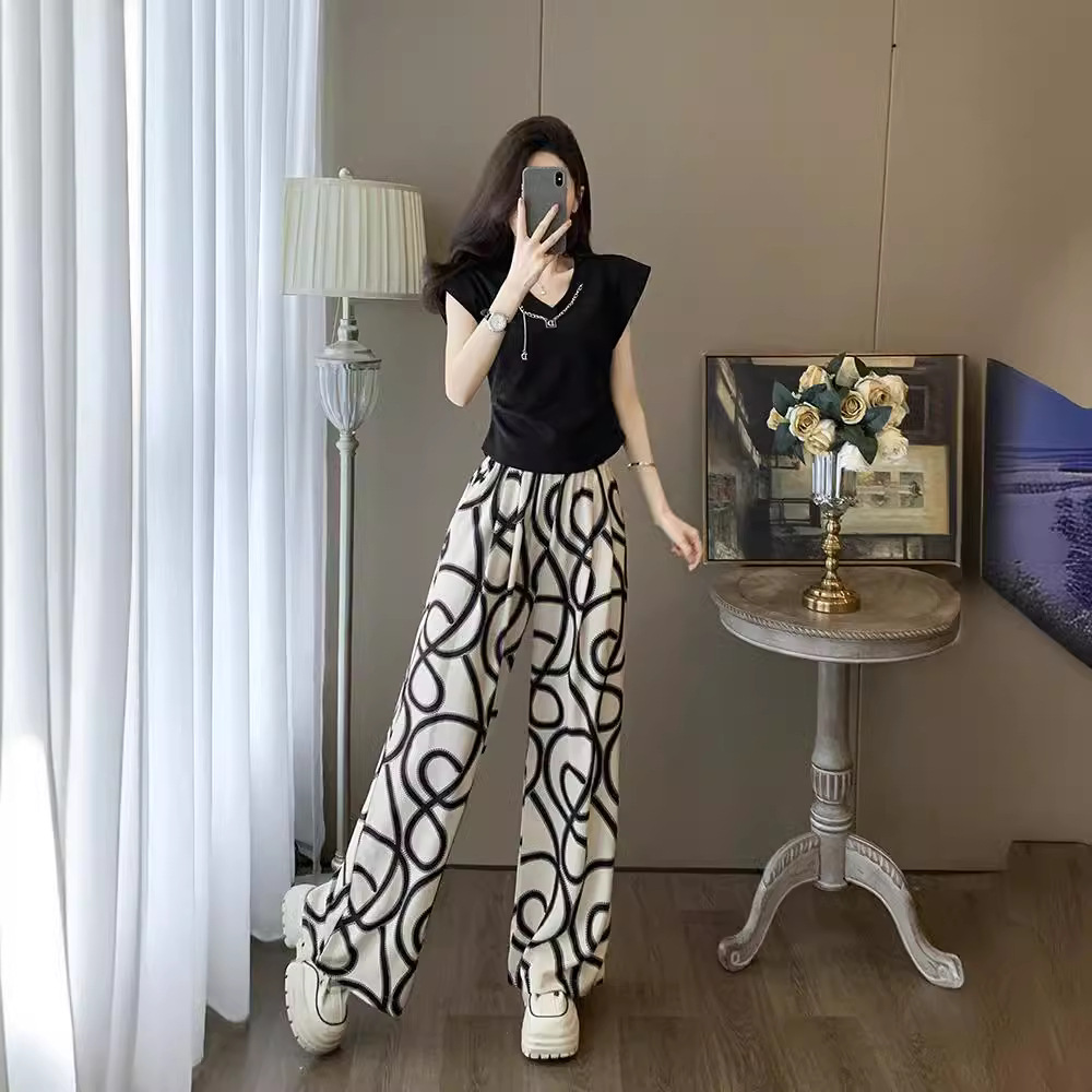 | nameOriginal | 2024 Summer Design Sense Fashion Hundred Short-sleeved T-shirt Top High Waist Draped Wide-leg Pants Two-piece Set |