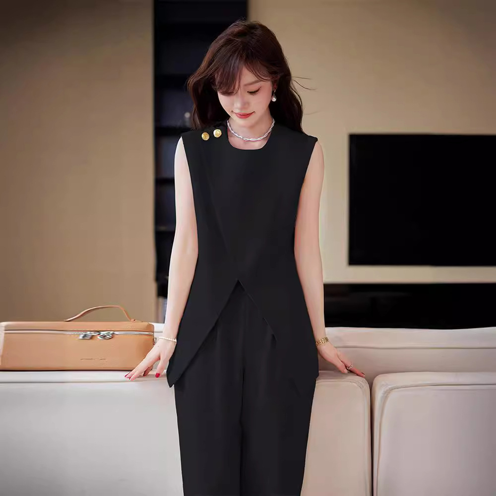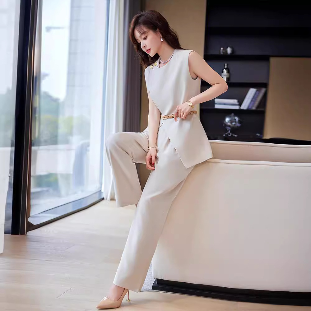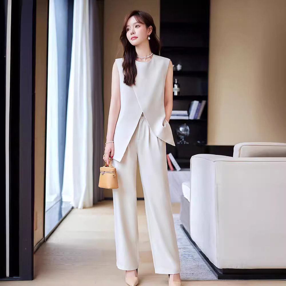 | nameOriginal | 2024 Summer Korean Style Irregular Sleeveless Vest Top High Waist Wide Leg Pants Set Trendy Fashion Apricot Two-piece Women |