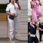 2024 Summer New Amazon European and American Women's Short-sleeved Single-breasted Pocket Decorative Solid Color Office Jumpsuit Women