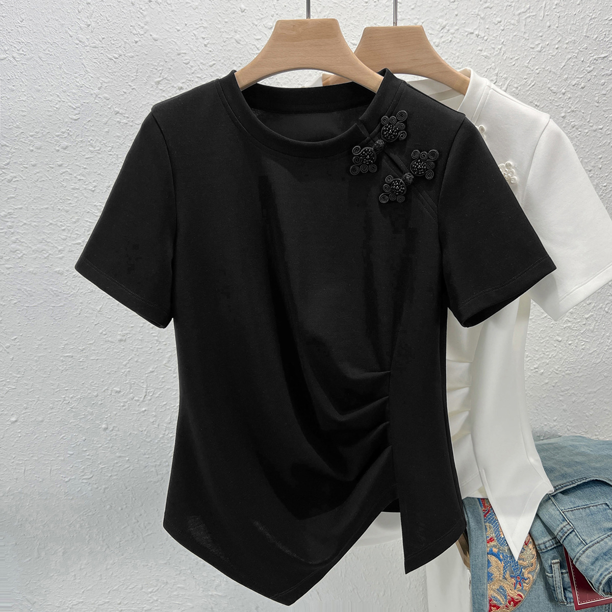 | nameOriginal | 2024 Summer new Chinese style Chinese style buckle white T-shirt women's short sleeve design sense niche irregular pleated top |