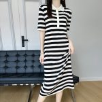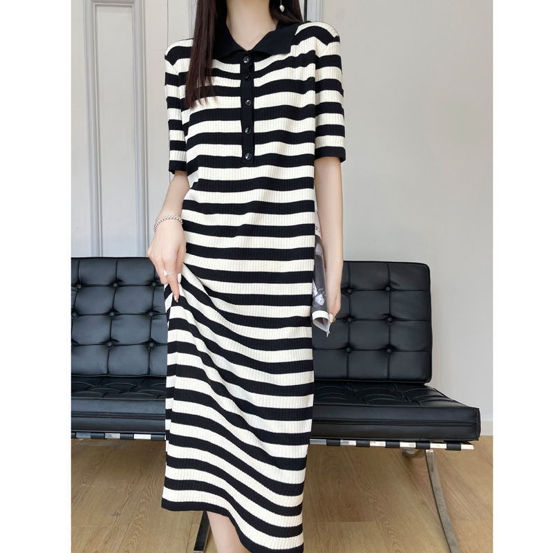 2024 Summer New College Style POLO Collar Short-sleeved Ice Silk Knitted dress Contrast Color Striped All-match Long Dress