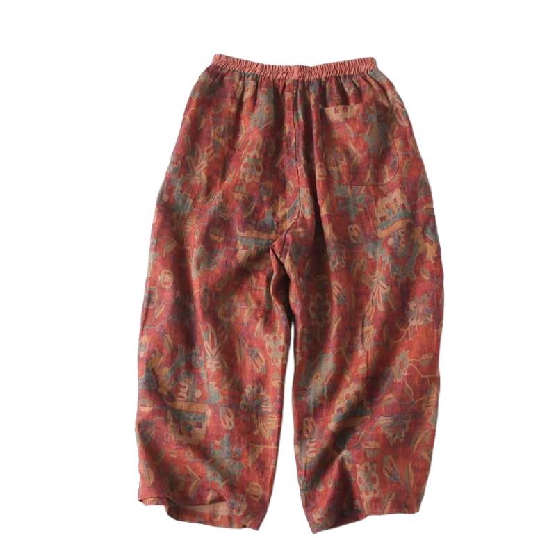 2024 summer new color linen wide leg pants loose elastic waist contrast color linen printed trousers