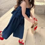 | nameOriginal | 2024 Summer New Girl suit Little Girl Sling Denim Wide Leg Pants Baby Short Sleeve Top Two-Piece Set |