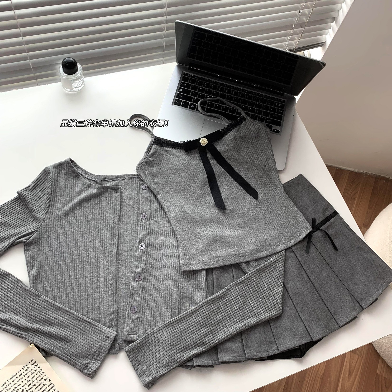 | nameOriginal | 2024 Summer New Gray Bow Strap Cardigan Pleated Skirt Two-piece Set |