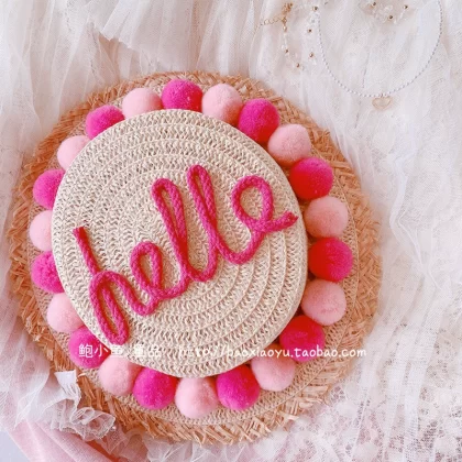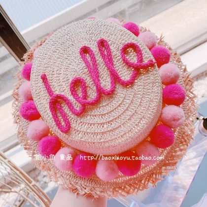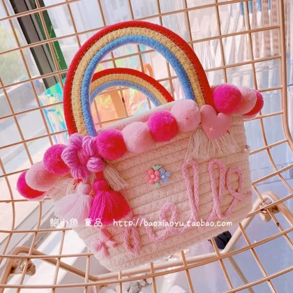 2024 summer new Korean ins parent-child travel handmade three-dimensional ball woven straw hat portable basket bag