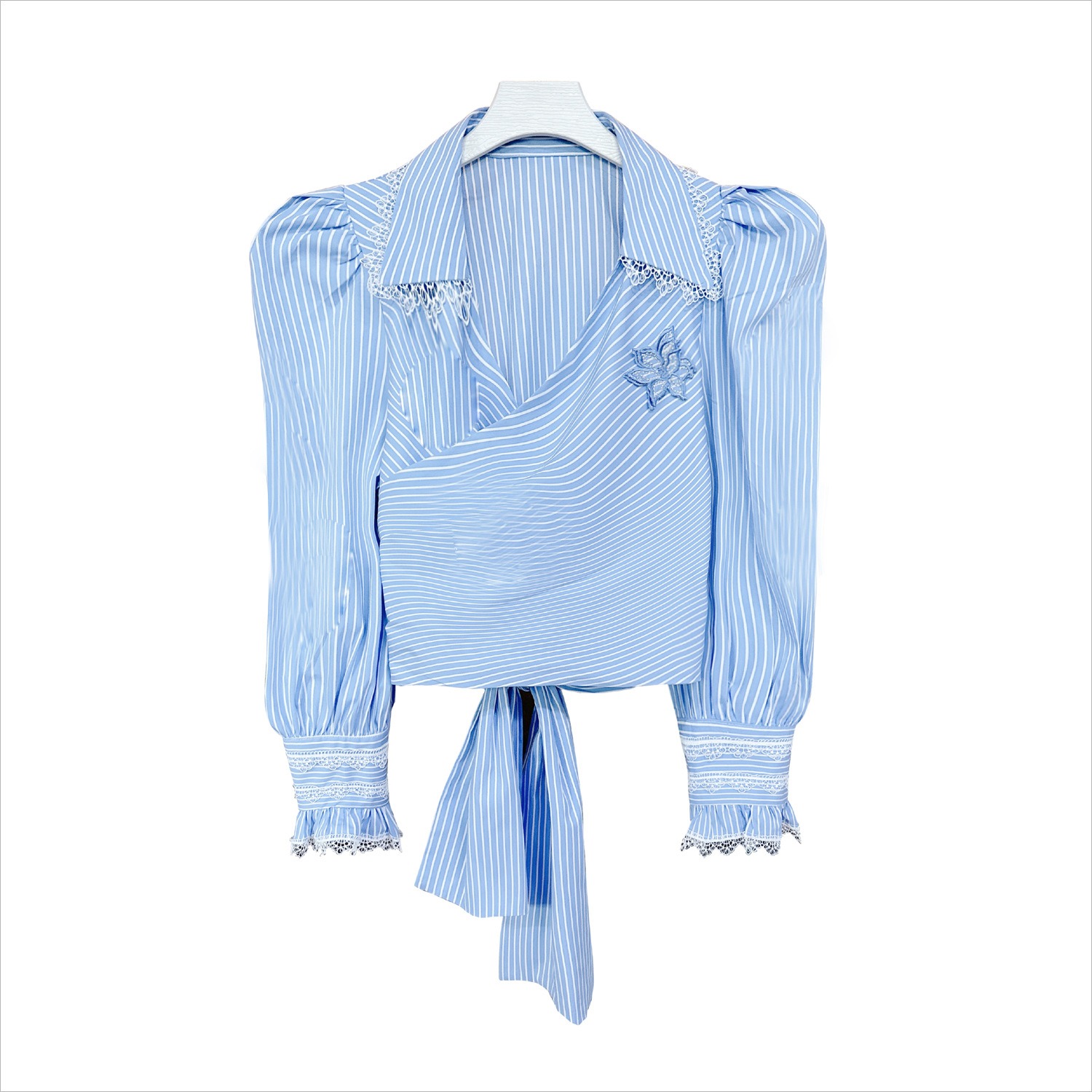 2024 summer new Liu Yifei rose with blue V-neck lapel long sleeve embroidered flower shirt