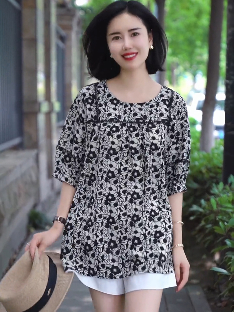 nameOriginal | 2024 Summer New Loosen Black and White Printed Lightweight All-match Shirt Half-sleeve Half-sleeve Chiffon Top for Women |