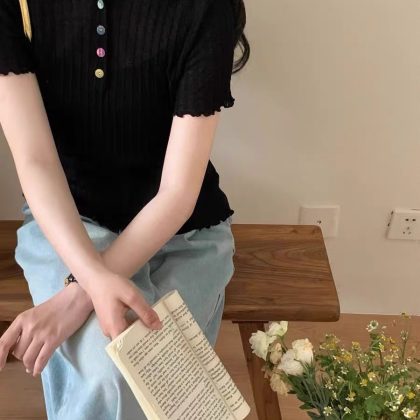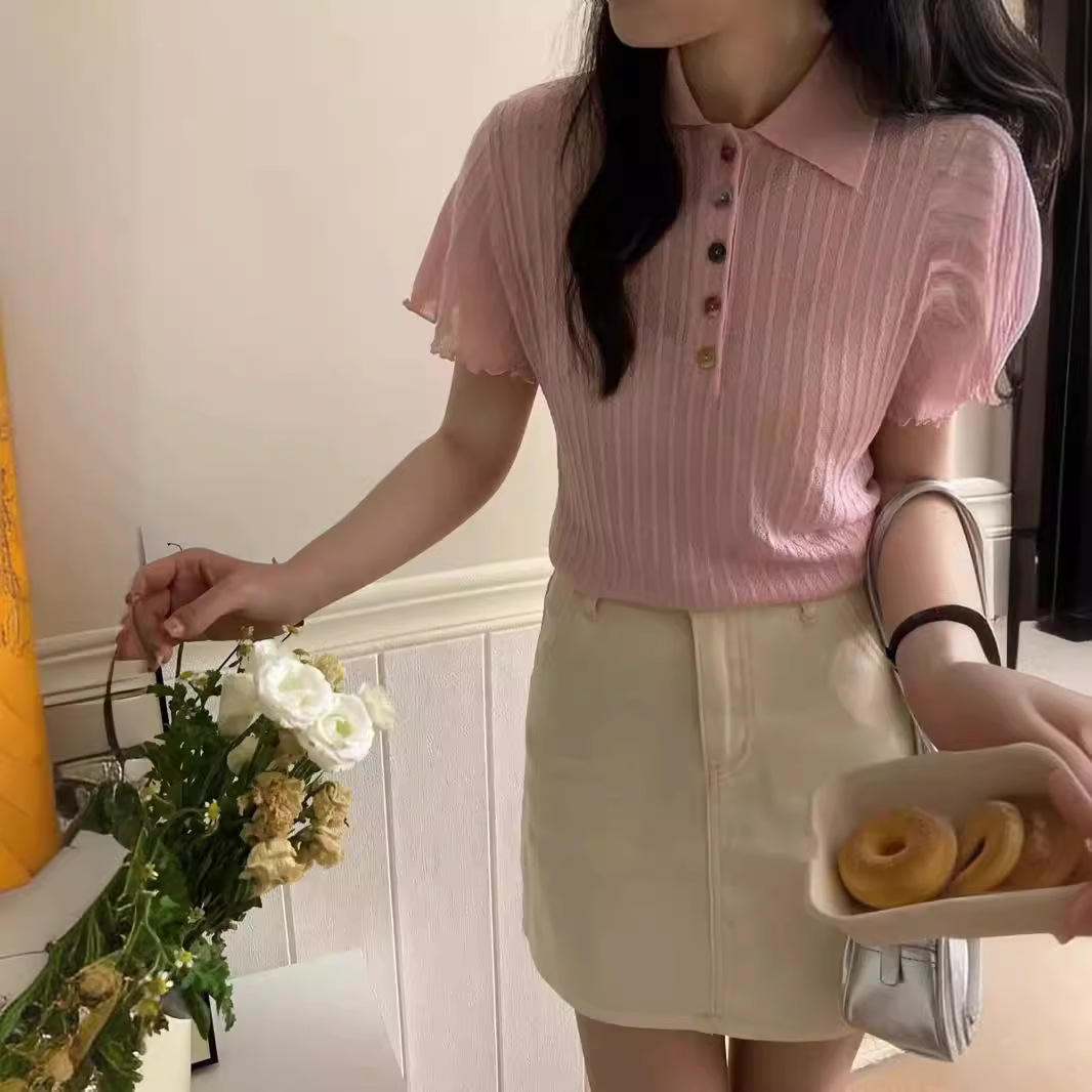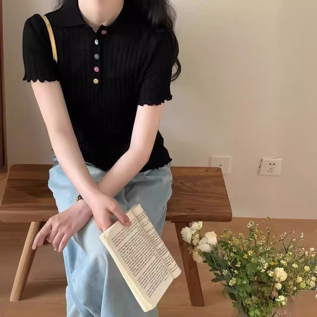 | nameOriginal | 2024 Summer New Niche Design Sense Colorful Buckle Short-sleeved T-shirt Slimming Knitted Polo Shirt |