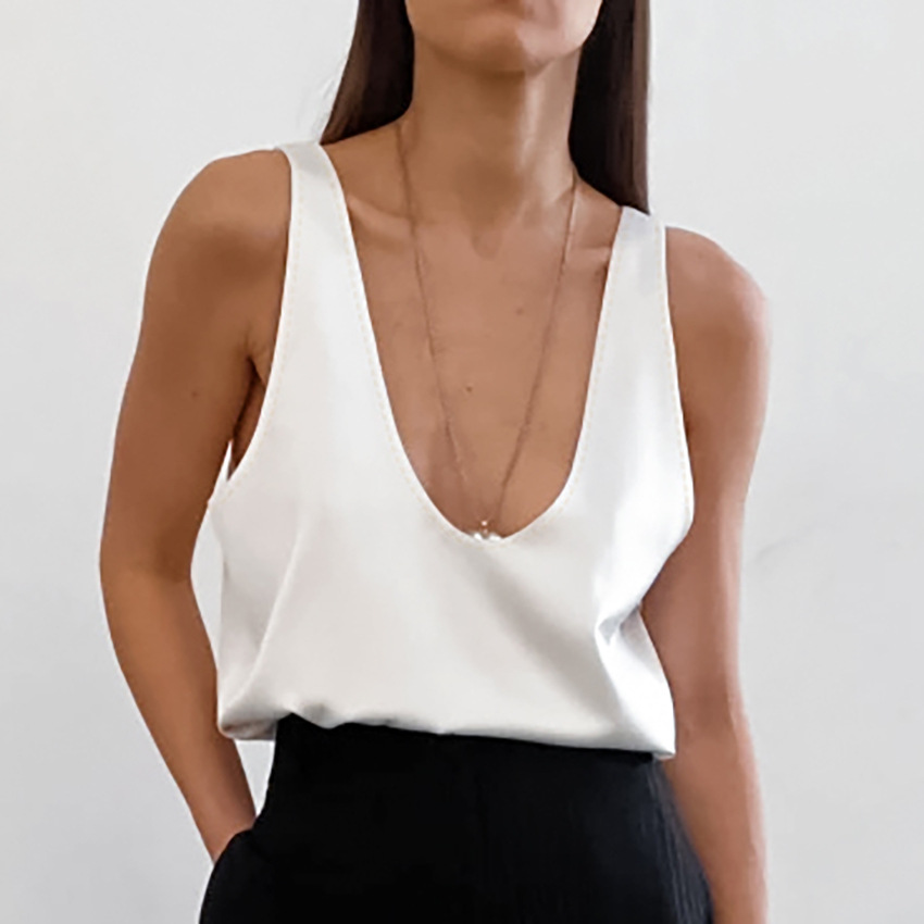 2024 صيف جديد لون نقي من الساتان على شكل حرف U بلا أكمام تي شيرت الأوروبية والأمريكية كل مباراة نمط الشارع سترة بالجملة النساء