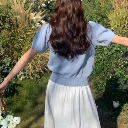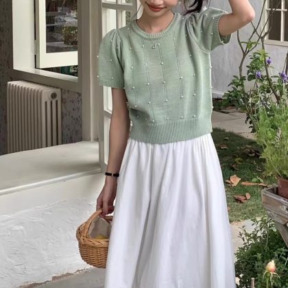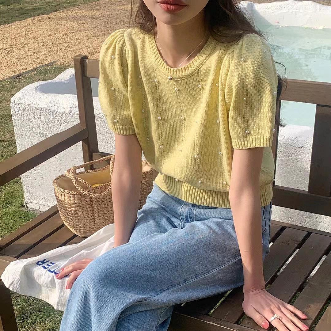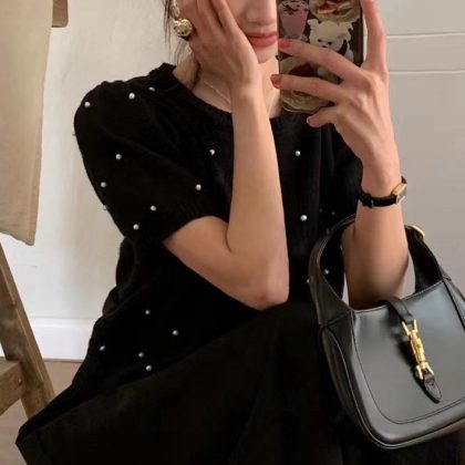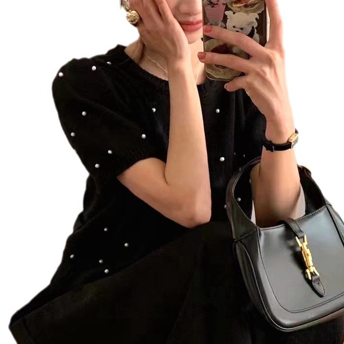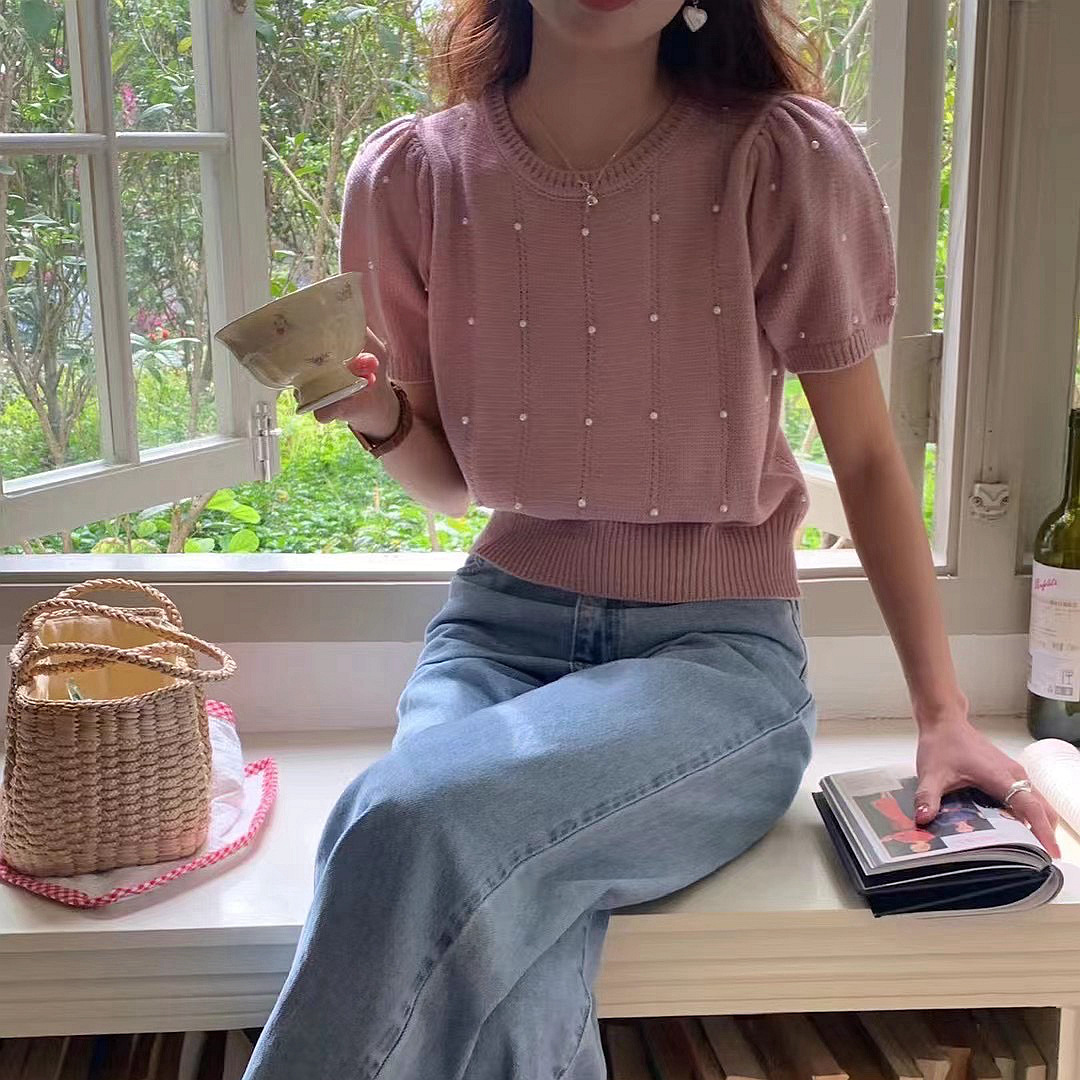 | nameOriginal | 2024 Summer New Vintage Elegant Slim-Fit Slimming Short Round Neck Beaded Short Sleeve Thin Sweater Women's Top |