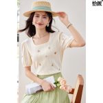 2024 Summer Pastoral Age-reducing Square Collar Short-sleeved T-shirt Women's Striped Texture Embroidered Puff Sleeve Top