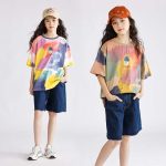 تي شيرت صيفي قصير الأكمام للوالدين والطفل لعام 2024 على الطراز الغربي طباعة وصباغة على الطراز الكوري على الطراز الغربي قميص مموه فضفاض للتسليم عبر الحدود