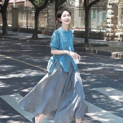 | nameOriginal | 2024 Summer Zen Loose Casual Skirt Two-piece Set French Artistic Retro Shirt Short-sleeved Top for Women |