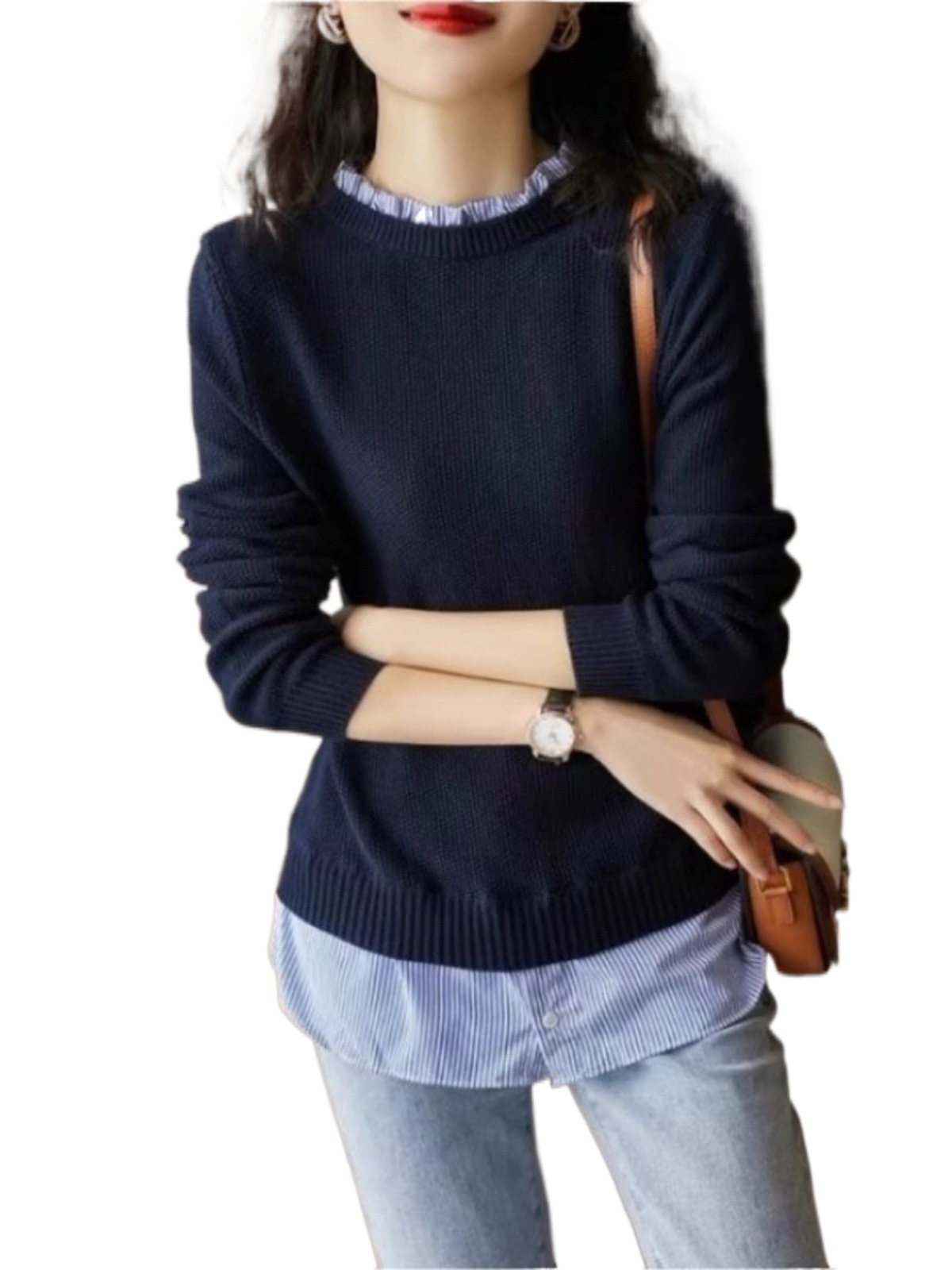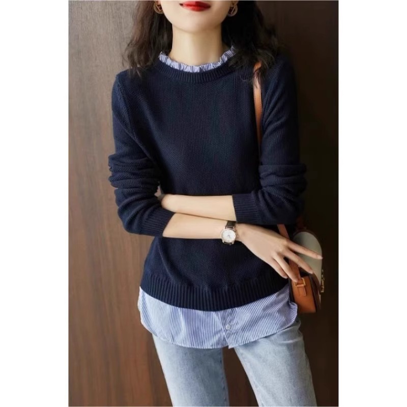 2024 Withdrawal Standard Cut Women's Original Single Shirt Stitching Fake Two-piece Top Long-sleeved Knit Sweater