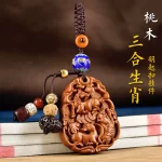 2024 Year of the Rabbit Mascot Twelve Zodiac Signs Three In One and Six In One Lucky Peach Wood Carved Pendant Keychain Pendant for Men and Women