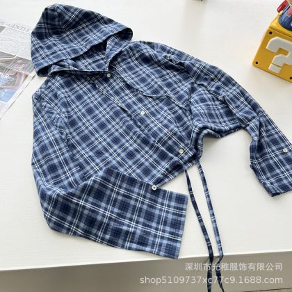 24 autumn and winter new cotton plaid hooded early autumn new loose short sweater