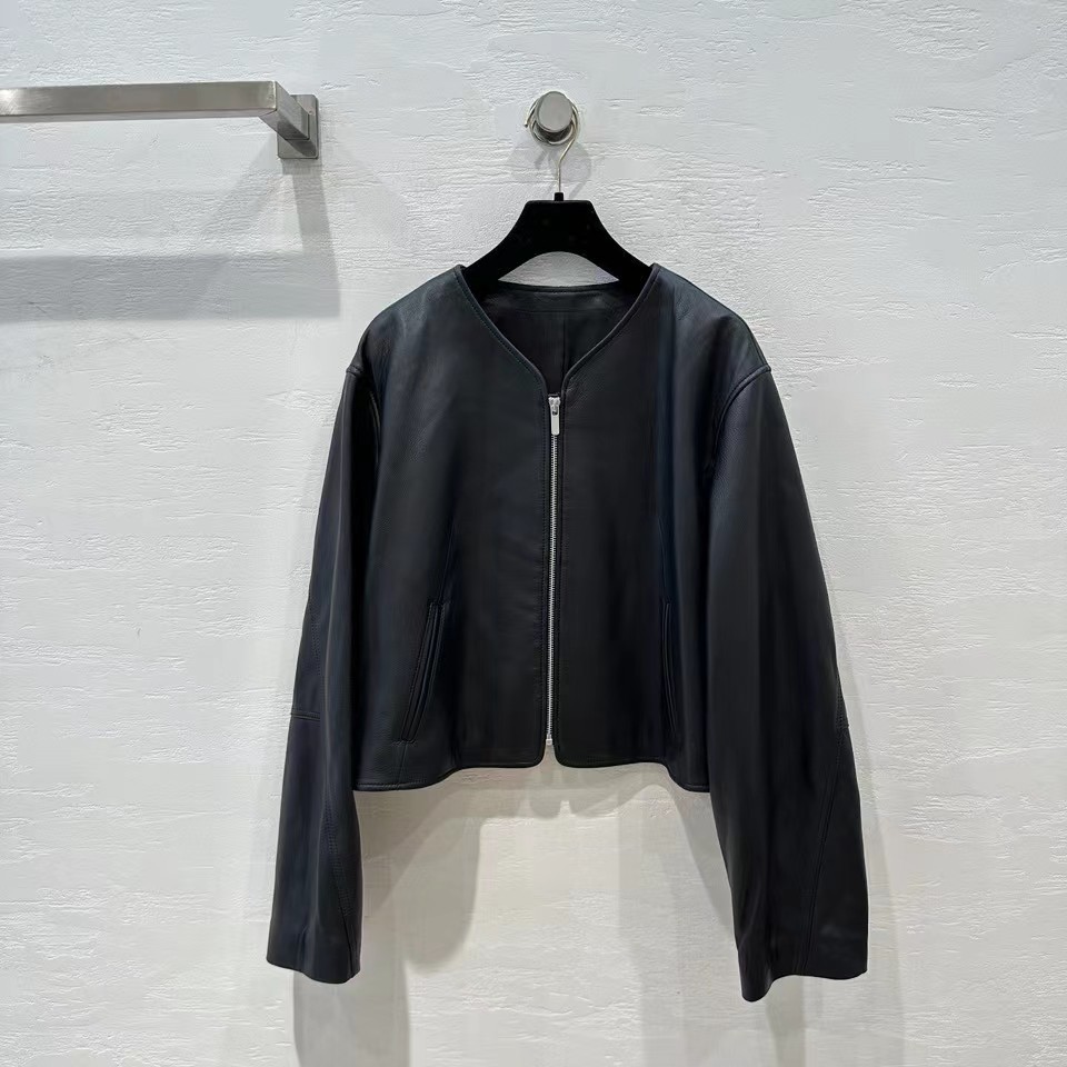 24 Early Autumn New Leather Elegant Short Casual Jacket Leather Jacket Imported Lambskin Elegant Small V-Neck