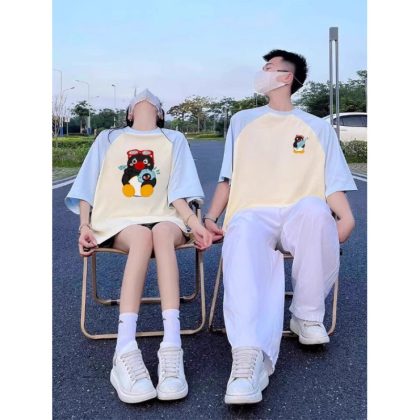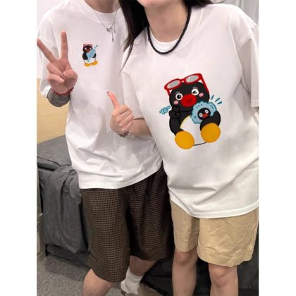 [250 جرام غزل مزدوج -220 جرام ممشط] فستان زوجين خاص من القطن الخالص كارتون البطريق المد العلامة التجارية قصيرة الأكمام تي شيرت