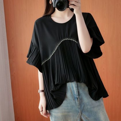 | nameOriginal | 300 Jin chubby girl plus size Top Belly Covering Flesh Slim Top Summer New Chic Loose Chiffon Stitching Short Sleeve |