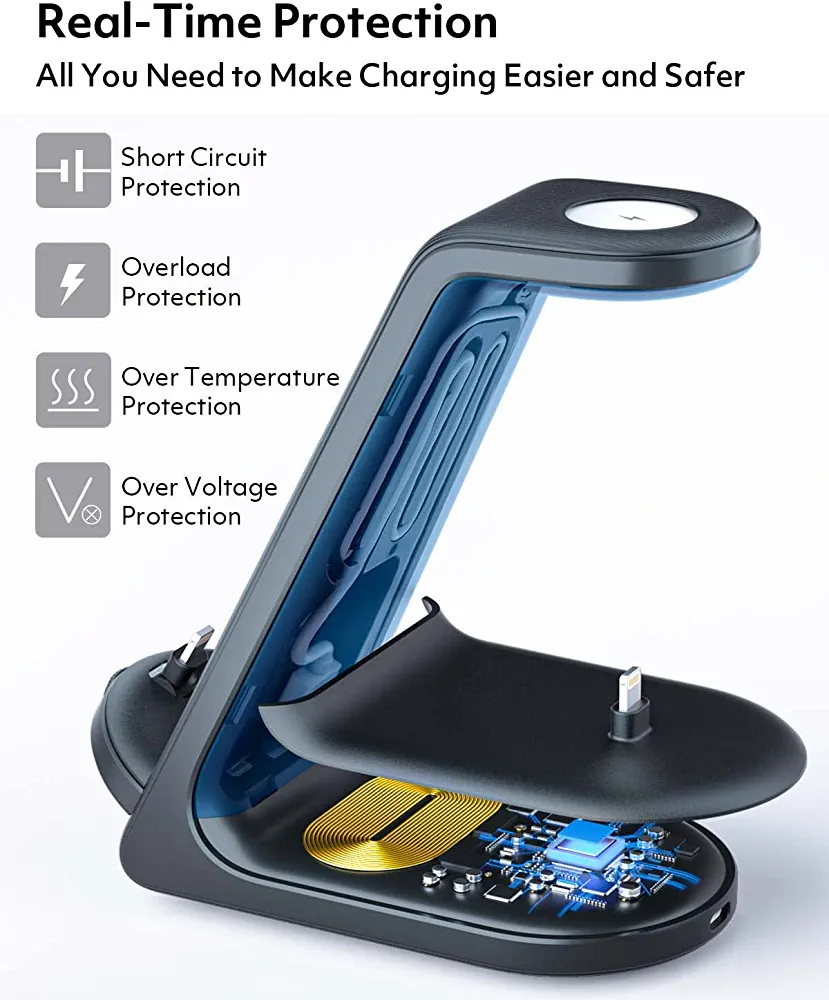 بفضل تصميمها الأنيق والمدمج، تعد قاعدة الشحن هذه مثالية للاستخدام في المنزل أو في المكتب. يتميز بلوحة شحن لاسلكية لأجهزة iPhone و AirPods و iWatch، بالإضافة إلى منفذ USB لشحن الأجهزة الأخرى. تضمن تقنية الشحن السريع شحن أجهزتك بالكامل في أي وقت من الأوقات، حتى تتمكن من البقاء على اتصال وإنتاجية طوال اليوم.