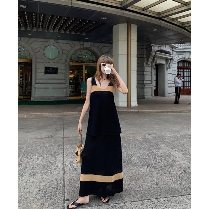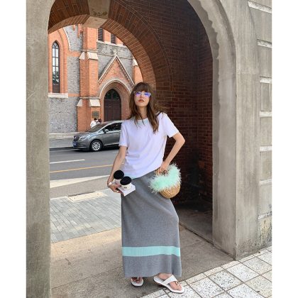 [5/29 NEW] Thirteen lines of women's fashion contrast skirt high waist A- shaped vertical knit skirt Tencel