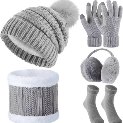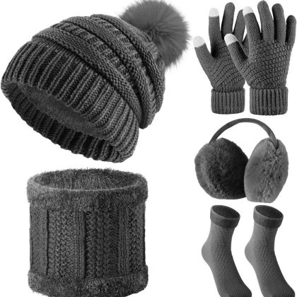 مجموعة مكونة من 5 قطع من سترة التزلج الشتوية للسيدات، وقبعة محبوكة، ووشاح، وقفازات، وأغطية للأذنين، وجوارب
