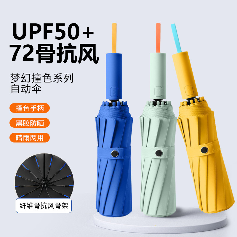 72-Bone Large Fully Automatic Umbrella High Color Value Contrast Color Series Folding Sunny Umbrella Anti-Storm Reinforced Black Sunshade