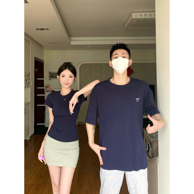 A generation of 2024 real shot new summer blue white slim men's and women's short sleeve sweethearts outfit