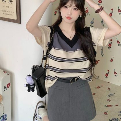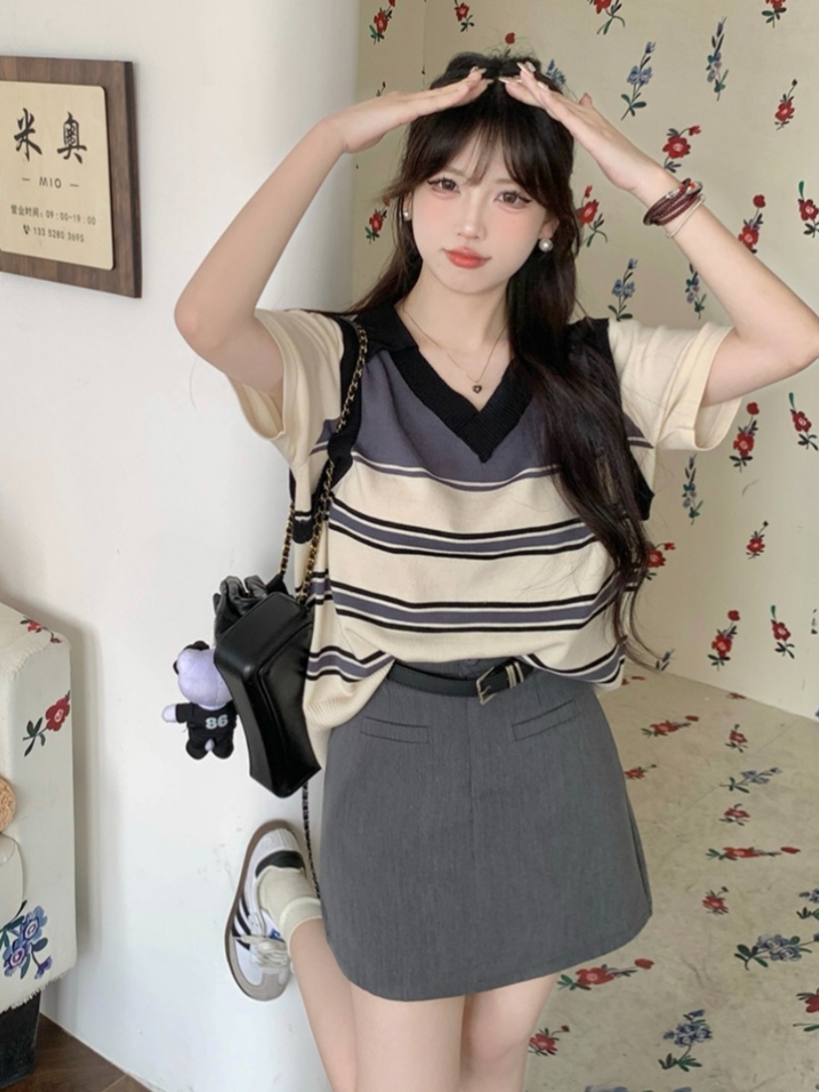 Age-reducing college style striped sweater for fat girls fake two pieces