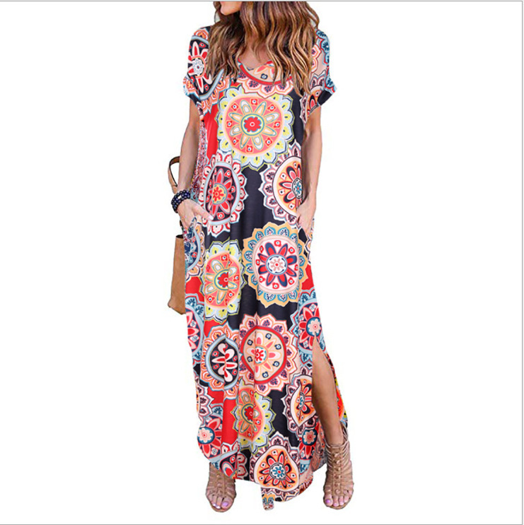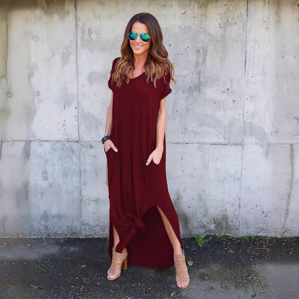 | nameOriginal | AliExpress Amazon European and American solid color stitching short sleeve V-neck split large swing loose long dress |