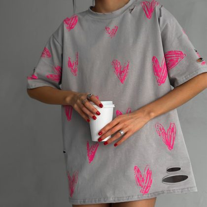 | nameOriginal | AliExpress popular round neck shoulder heart-shaped printed ripped design washed short sleeve T-shirt loose fashion brand top |