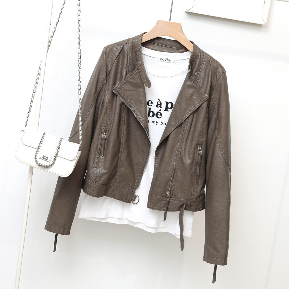 Amazon 2022 Autumn New Simple Collar PU Leather Women's Short Korean-style Bike Clothing Slim-fit Leather Jacket