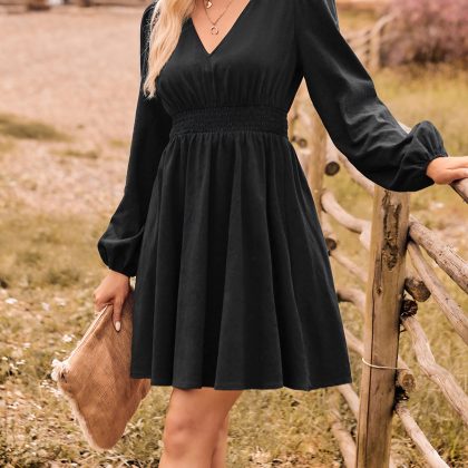 | nameOriginal | Amazon 2023 fashion V-neck casual women's clothing European and American autumn and winter new solid color waist long sleeve slim fit dress |