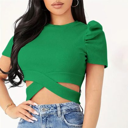 Amazon Cross-border Foreign Trade Round Neck Puff Sleeve Navel Short Top Women's Sexy Knitted T-shirt Women's Spring and Summer Women's Clothing