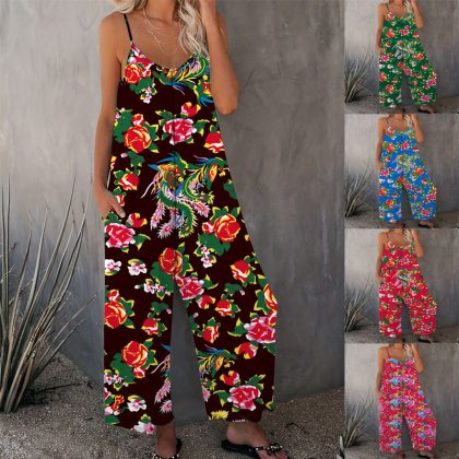 | nameOriginal | Amazon European and American 2024 Summer new women's trousers cross-border printed pocket loose casual sling jumpsuit |