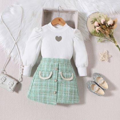 | nameOriginal | Amazon European and American Chanel style Autumn New girls' suit solid color long-sleeved shirt with plaid short skirt two-piece set |