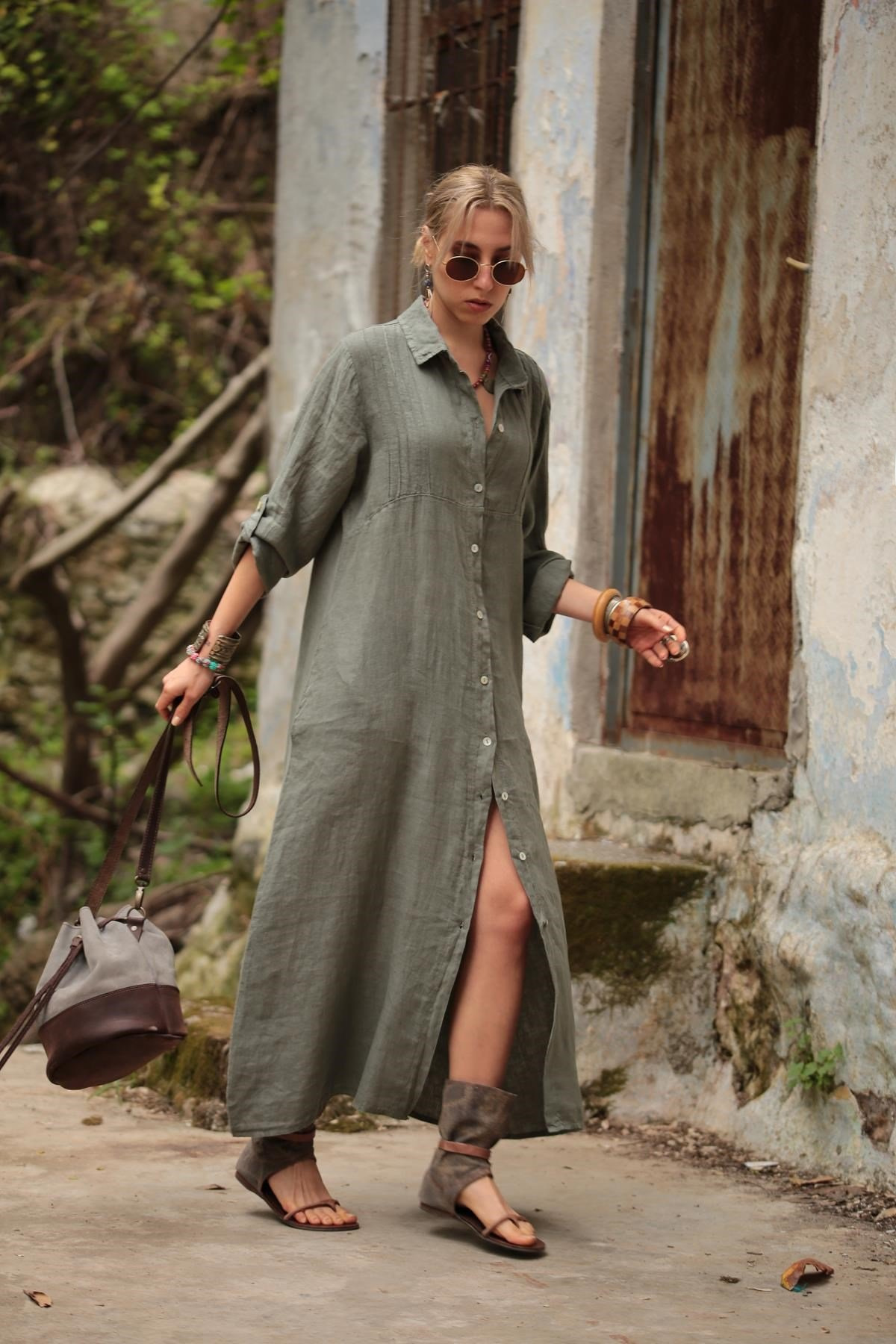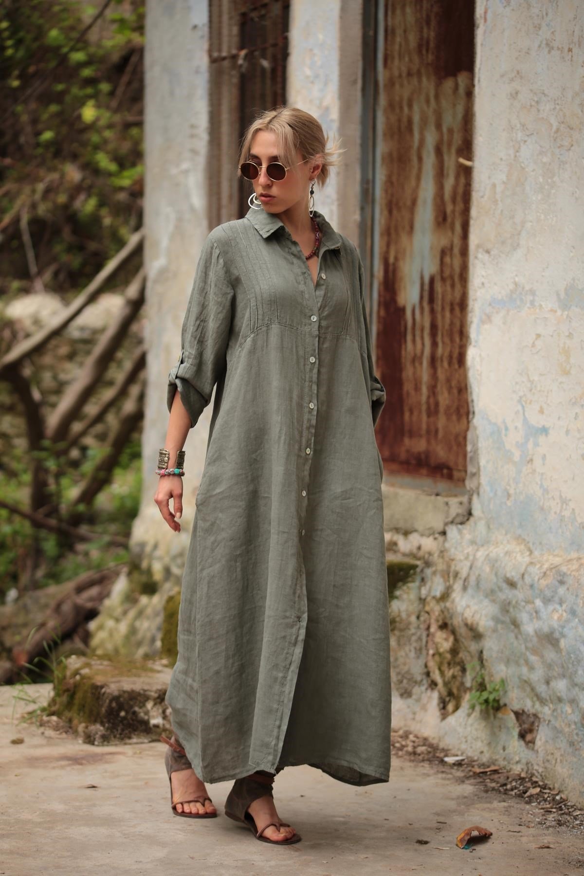 فستان طويل أنيق وبسيط وفضفاض من أمازون الأوروبي والأمريكي بلون سادة وياقة واقفة وأكمام طويلة