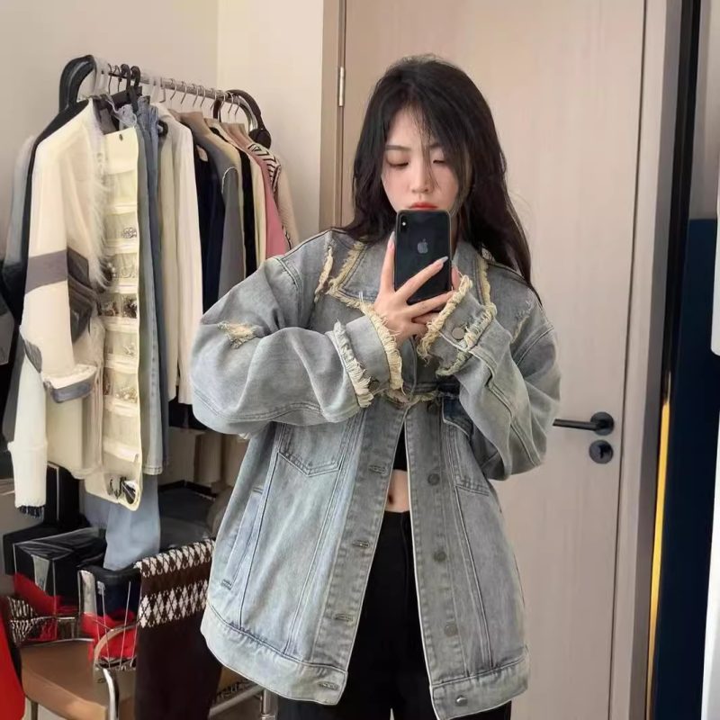 American retro high street fashion brand oversize workwear washed old ripped Denim coat women's spring and autumn jacket