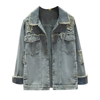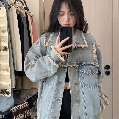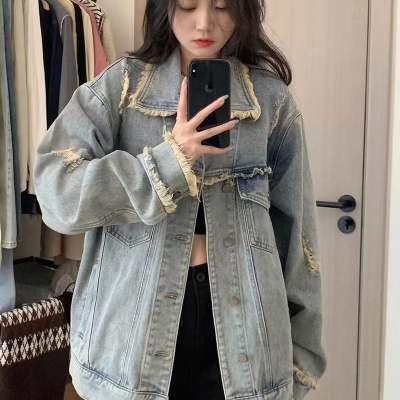 ملابس عمل كبيرة الحجم من العلامة التجارية الأمريكية الرجعية للأزياء الراقية في الشارع، معطف جينز ممزق قديم للسيدات للربيع والخريف