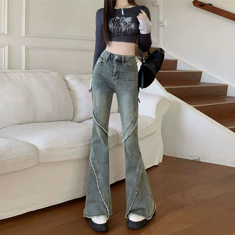 | nameOriginal | American retro nostalgic petite high-waisted raw edge spliced flared pants stretch slim fit horseshoe denim trousers for women |