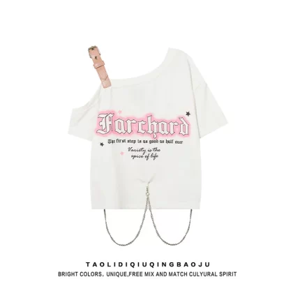 | nameOriginal | American street style star letter printed short-sleeved T-shirt for women trendy brand sweet and cool hot girl off-shoulder chain short top |