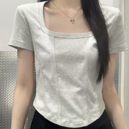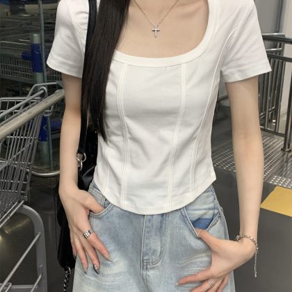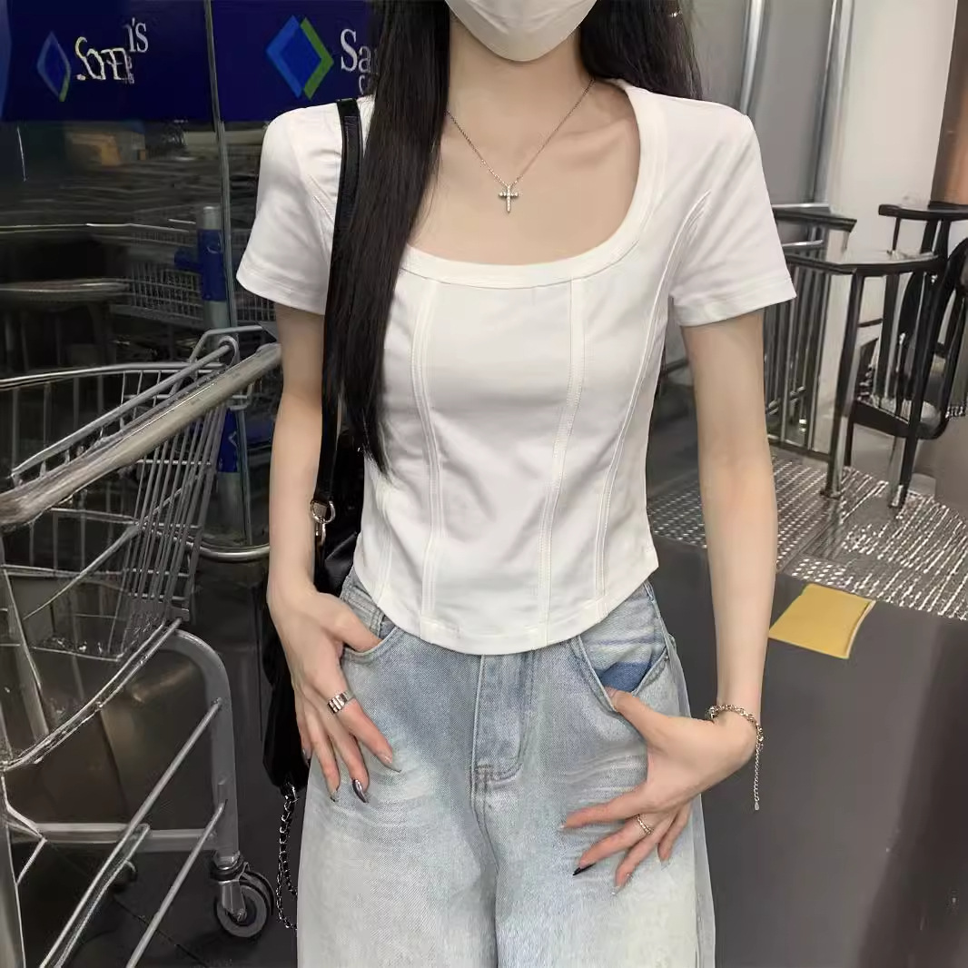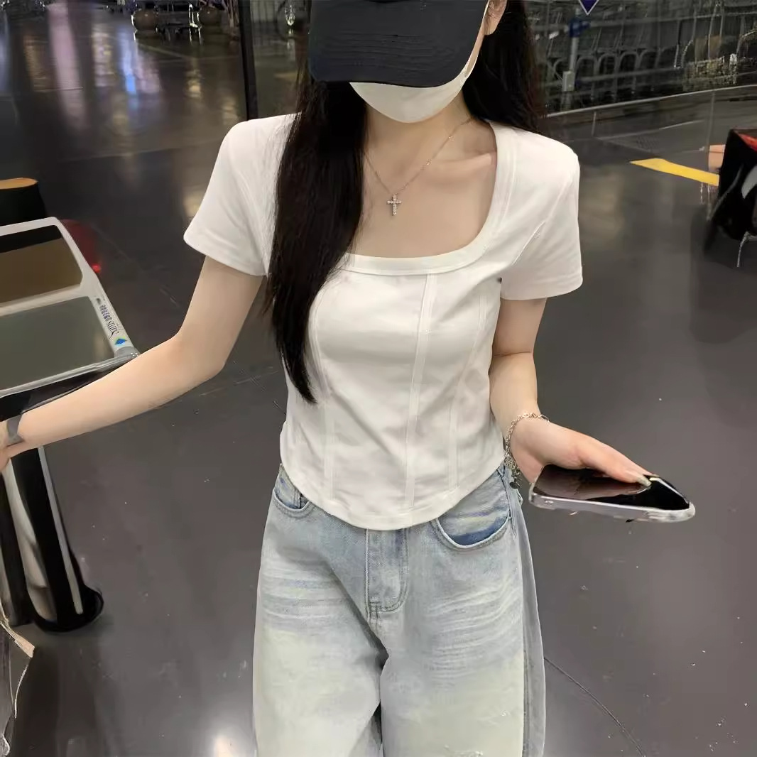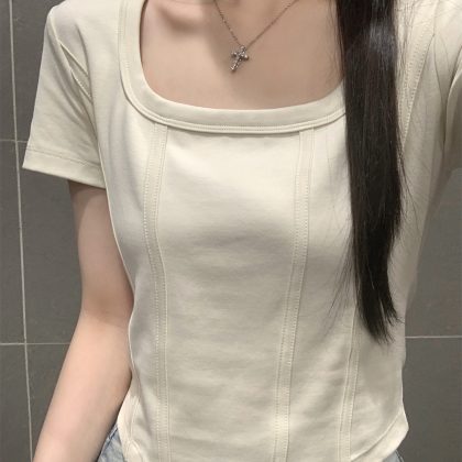 | nameOriginal | American Style 2024 Summer New Korean Style Square Collar Shoulder Fish Bone Solid Color Short All-match Short-sleeved T-shirt Women's Top |