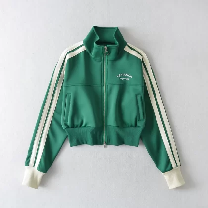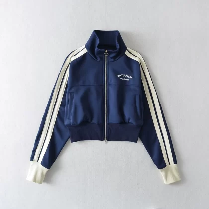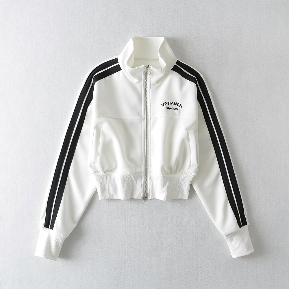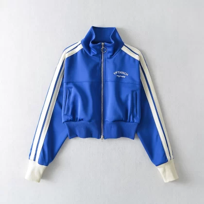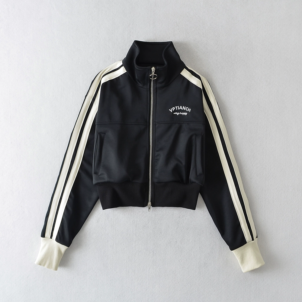 | nameOriginal | American style double zipper stand collar short embroidery with color block letters |