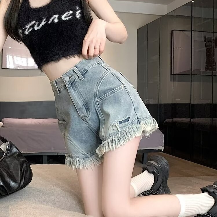 | nameOriginal | American Style Fringe Tassel Wide Leg Denim Shorts Women's 2024 Summer Thin High Waist Loose Slim-fit A- shaped Hot Pants |